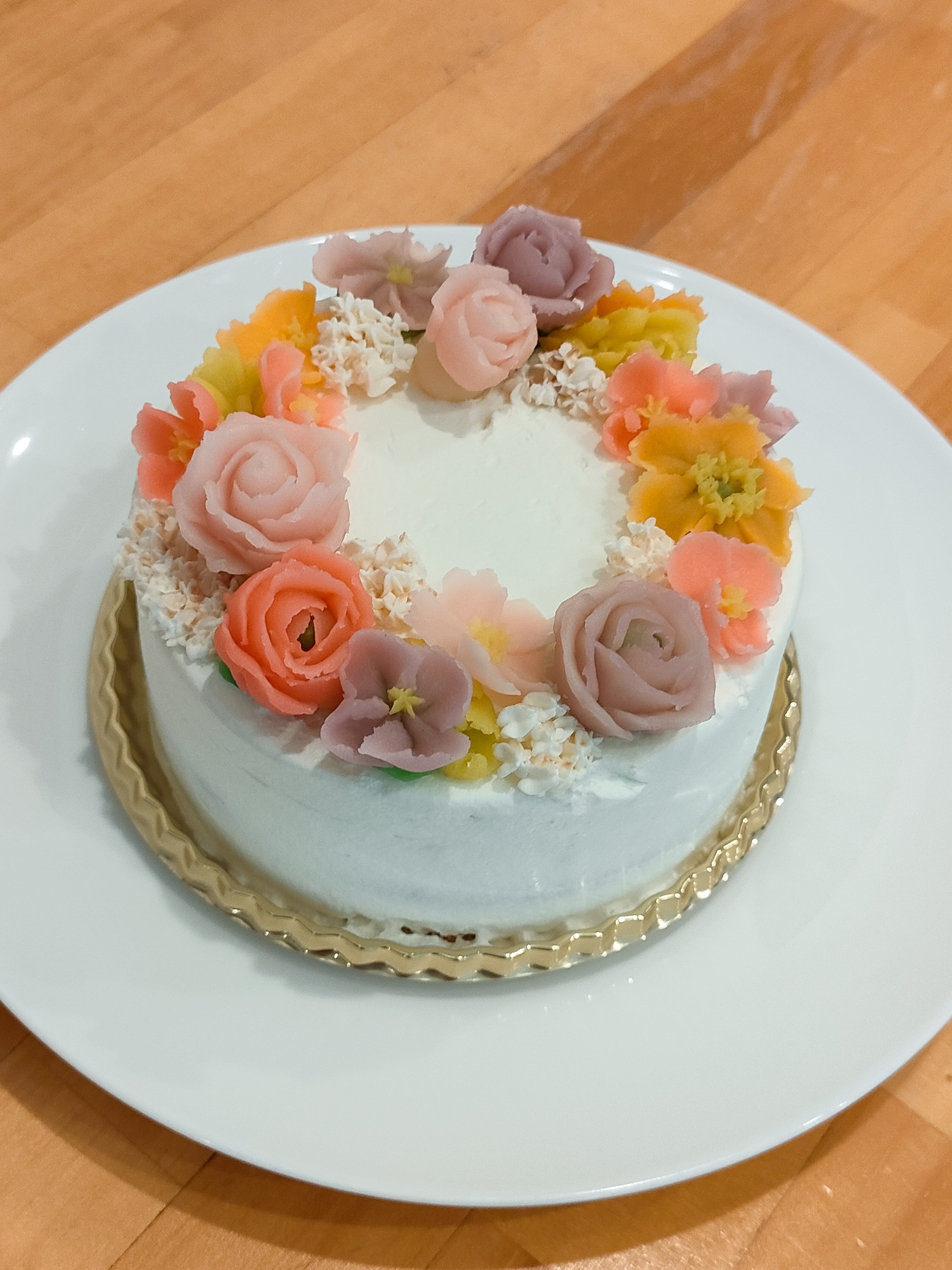 白あんで色とりどりのお花を絞り、ショートケーキタイプのホールケーキに飾りました。